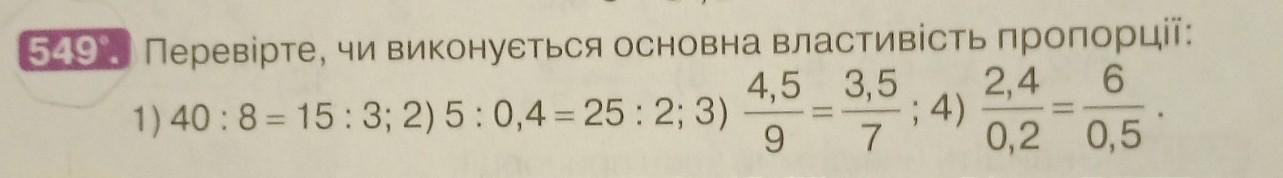 Перевірте чи виконується основна властивість пропорції:1)40:8=15:3; 2)5:0,4=25:2; 3)4,5/9=3,5/7; 4)2,4/0,2 =6/0,5