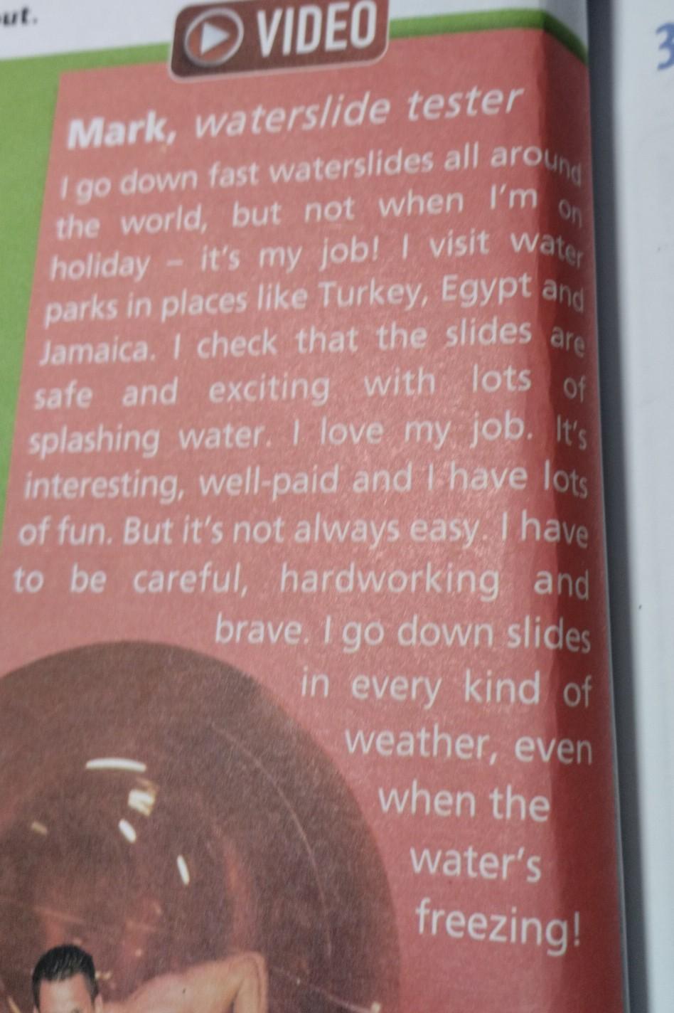 job description-tests slides in Turkey, Egypt and Jamaica. He checks if the waterslides are safe or not.