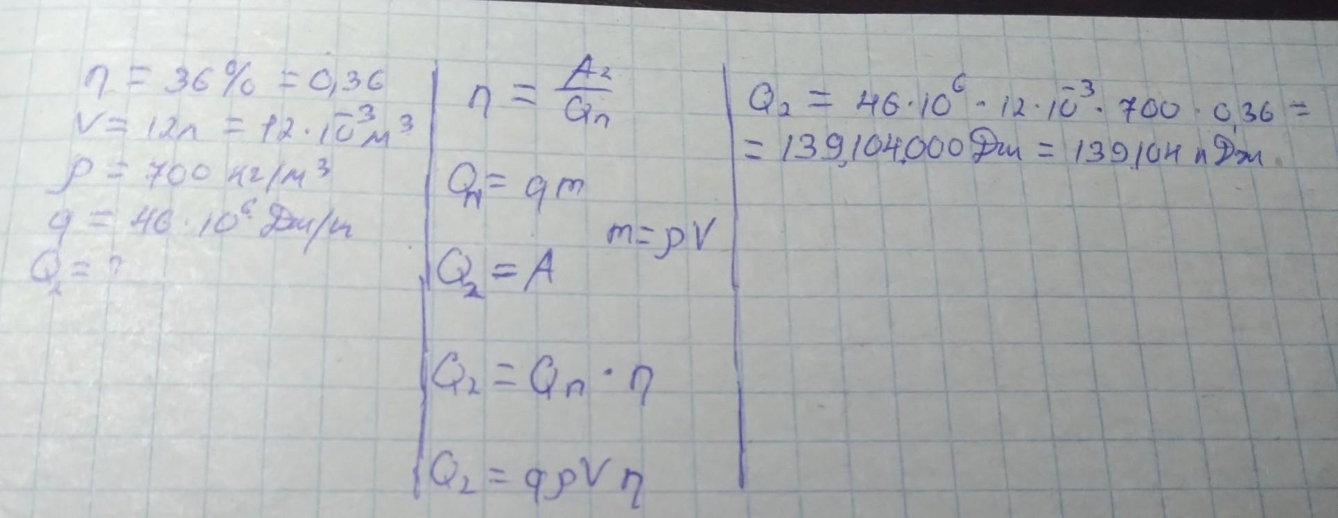 Яку корисну роботу виконає тепловий двигун, ККД якого становить 36 %, якщо в ньому згорить 12 л бензину? Густина бензину 700 кг/м3 , питома теплота згоряння 46 МДж/кг. Відповідь подати в КДж цілим числом.