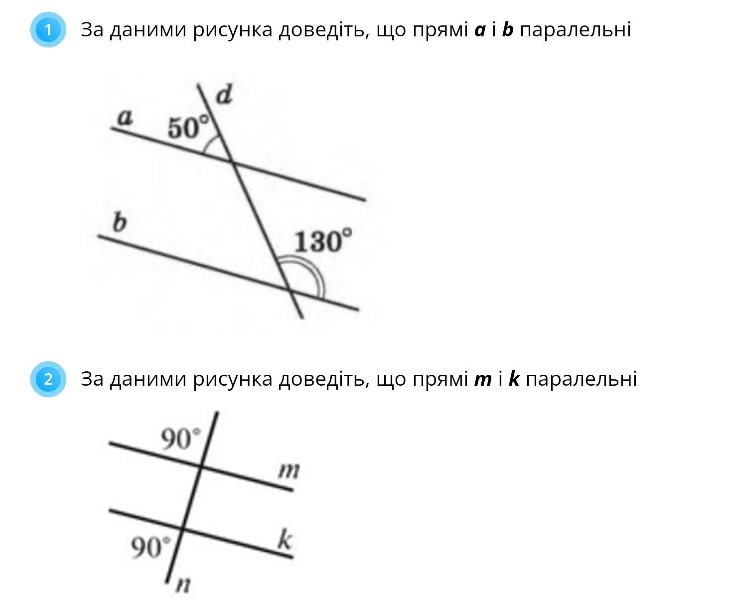 Пояснення:1.Якщо при перетині двох прями січною відповідні кути рівні,то прямі паралельні(сума суміжніх кутів дорівнюе 180°,180-50=130°,відповідні кути рівні 130=130°.2.Дві прямі,перпендикулярні до третьої прямої,паралельні( прямі m і n,k і n перетинаються під прямим кутом).