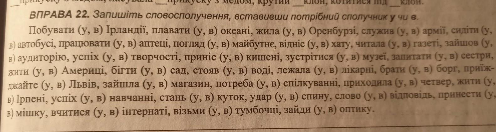 Побувати в Ірландії, плавати в океані, жила в Оренбурзі, служив у армії, сидіти в автобусі, працювати в аптеці, погляд у майбутнє, відніс у хату, читала в газеті, зайшов в аудиторію, успіх у творчості, приніс у кишені, зустрітися в музеї, запитати в сестри, жити в Америці, бігти в сад, стояв у полі, лежала в лікарні, брати в борг, приїжджайте у Львiв, зайшла в магазин, потреба в спілкуванні, приходила в четвер, жити в Ірпені, успіх у навчанні, стань у куток, удар у спину, слово у відповідь, принести в мішку, вчитися в інтернаті, візьми в тумбочці, зайди в оптику.