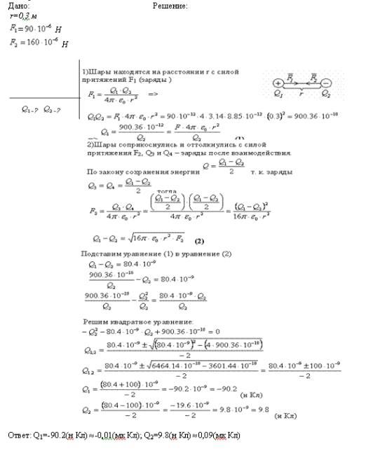 d = 0,2 м. Сила притяжения шаров F1 90 мкН. После того как шары прикоснулись друг к другу и развели на предыдущее расстояние,
