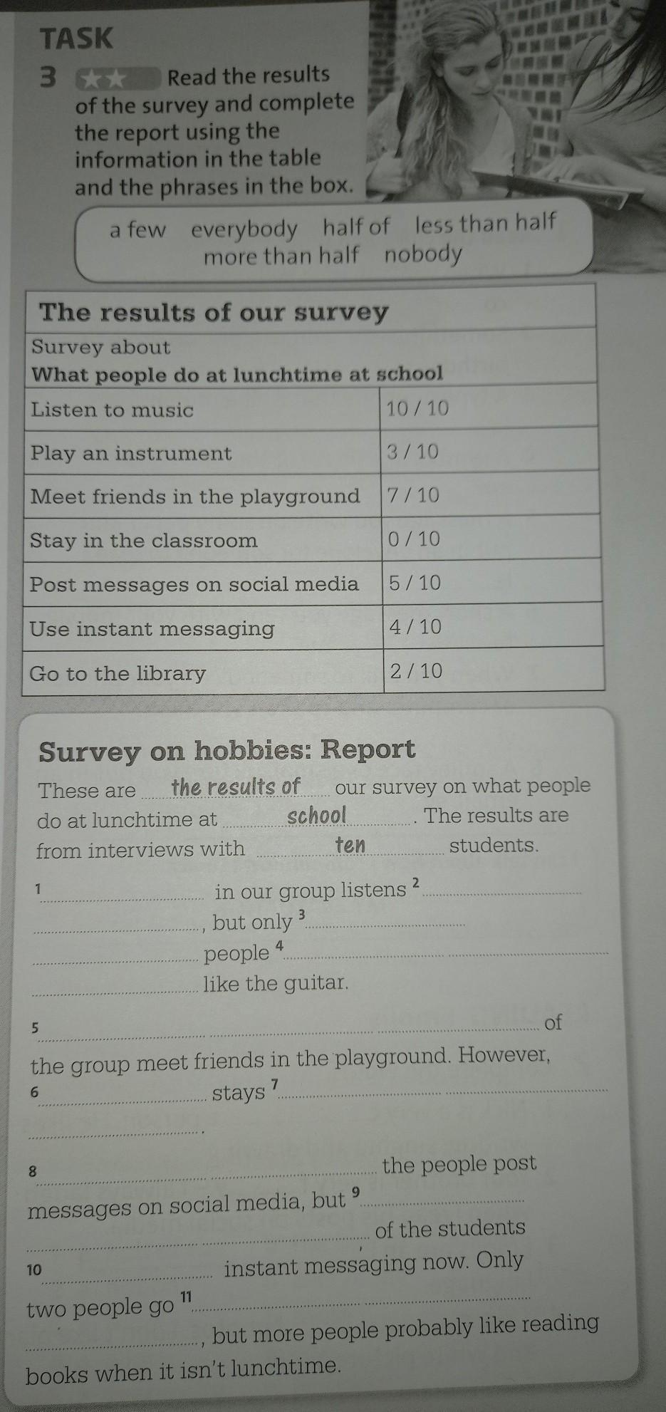 1Everybody 2to music 3few 4play instrument 5 more than half 6 nobody 7 in the classroom 8 Half of 9 less than half 10 use 11 to the library