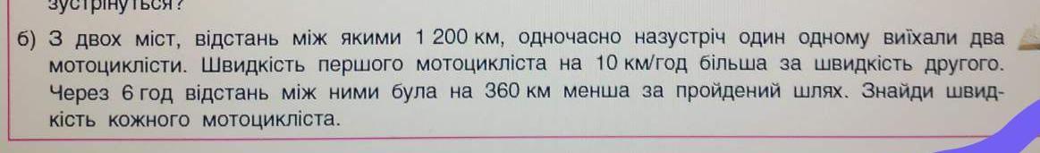 СРОЧНО ДАЮ 100 БАЛОВ З двох міст, відстань між якими 1 200 км, одночасно назустріч один одному виїхали два мотоциклісти. Швидкість першого мотоцикліста на 10 км/год бiльша за швидкість другого. Через 6 год відстань між ними була на 360 км менша за пройдений шлях. Знайди швид- кість кожного мотоцикліста.