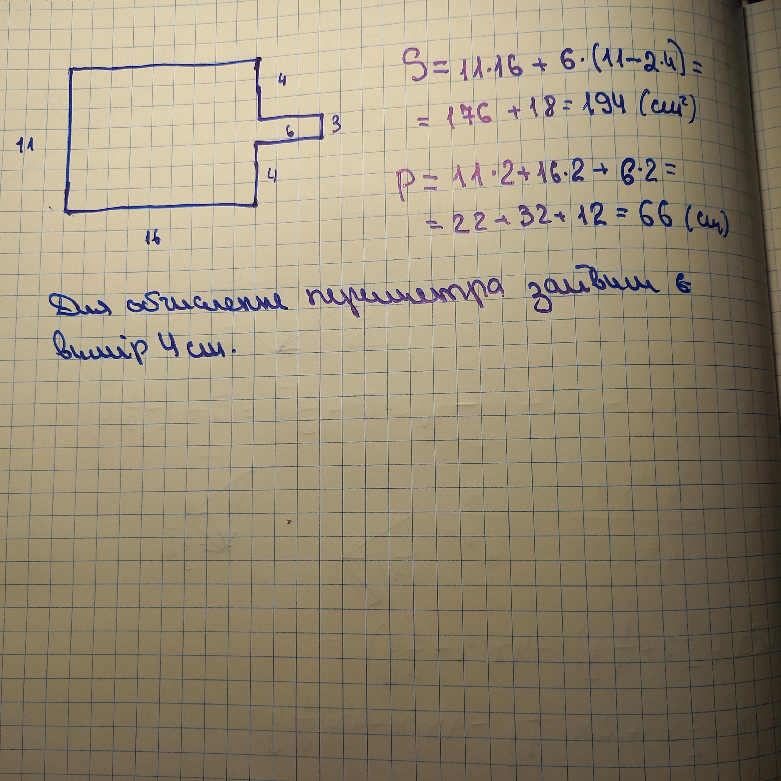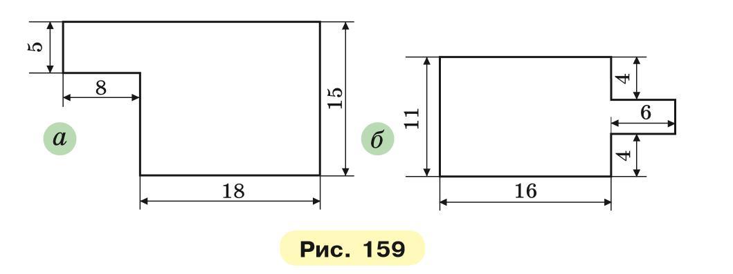 Обчисліть периметр і площу многокутника, зображеного на рисунку 159 (розміри дано в сантиметрах). Чи є на рисунку 159 зайві дані для обчислення периметра многокутника? (потрібно тільки зробити б)