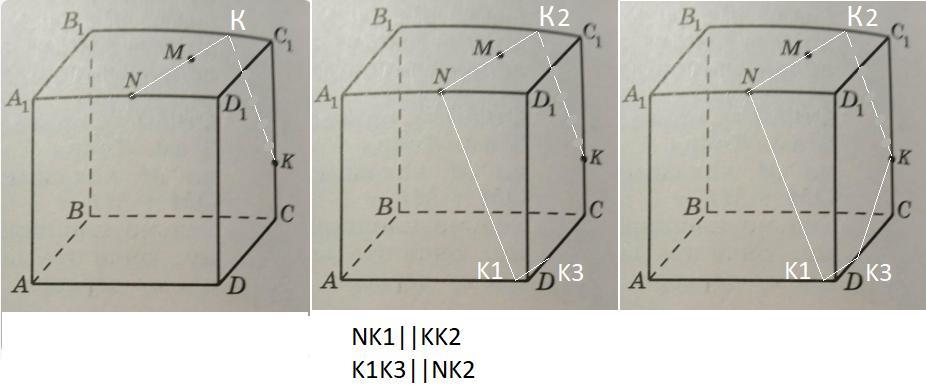 На малюнку 40 т.М належить грані А1В1С1D1 куба АВСDA1B1C1D1, а точки N i K належать віддповідно його ребрам А1D1 i CC1. Побудуйте переріз куба площиною KMN.