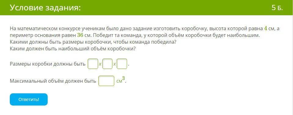Максимальный объем получится, если стороны основания будут равны 9 см.