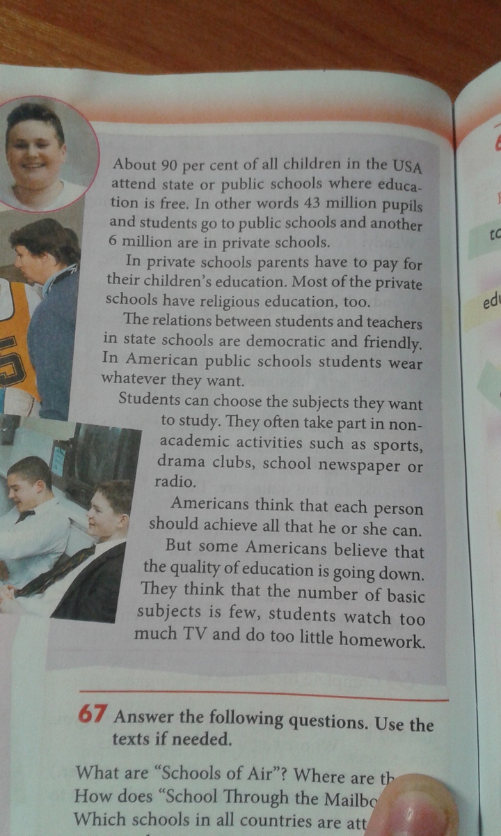 коло 90 процентов всех детей в США посещают государственные или общественные школы, где образования. Тион является бесплатным. Другими словами 43000000 школьники и студенты идут в государственные школы и еще 6 миллионов находятся в частных школах в частных школах родители должны заплатить за образование своих детей. Большинство частных школ имеют религиозное образование, тоже. Отношения между студентами и преподавателями в государственных школах являются демократическими и дружелюбны. В американских государственных школах студенты носить то, что они хотят Студенты могут выбрать предметы, которые они хотят изучать. Они часто принимают участие в неакадемических деятельности, таких как спортивные драмы клубов, школьная газета или радио американцы считают, что каждый человек должен достичь всего, что он или она может. Но некоторые американцы считают, что качество образования падает. Они думают, что число основных предметов почти нет, студенты слишком много смотреть телевизор и делать слишком небольшую домашнюю работу