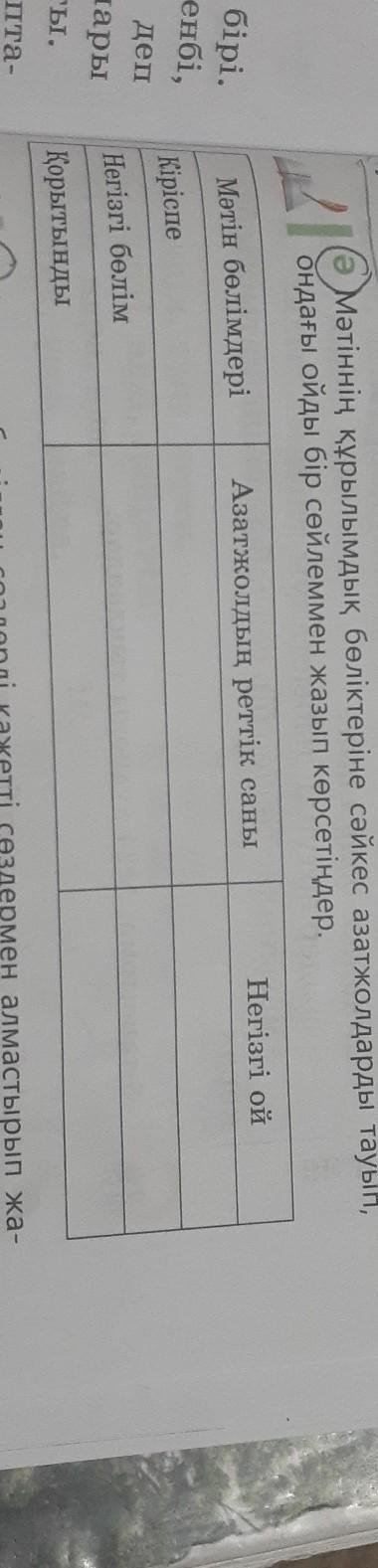 I I Pin отырады. Айдағы апталық өзгерістер арқылы халық адам болашағын/ райын болжаған. Мәтіннің құрылымдық бөліктеріне сәйкес азатжолдарды тауып, ондағы ойды бір сөйлеммен жазып көрсетіңдер. Азатжолдың реттік саны Мәтін бөлімдері Кіріспе Негiзгi бөлiм Негізгі ой Корытынды