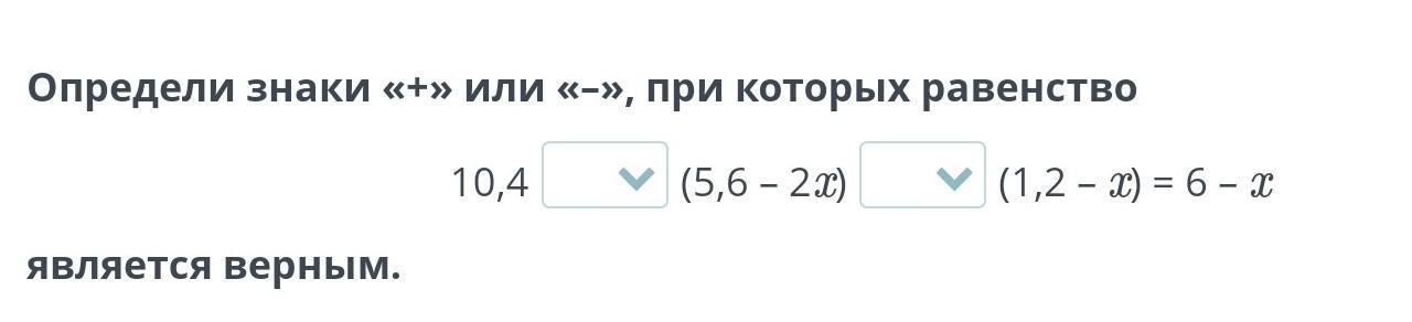Определи знаки «+» или «-», при которых равенство 10,4 (5,6 - 2x) является верным. Назад (1,2-x) = 6- x
