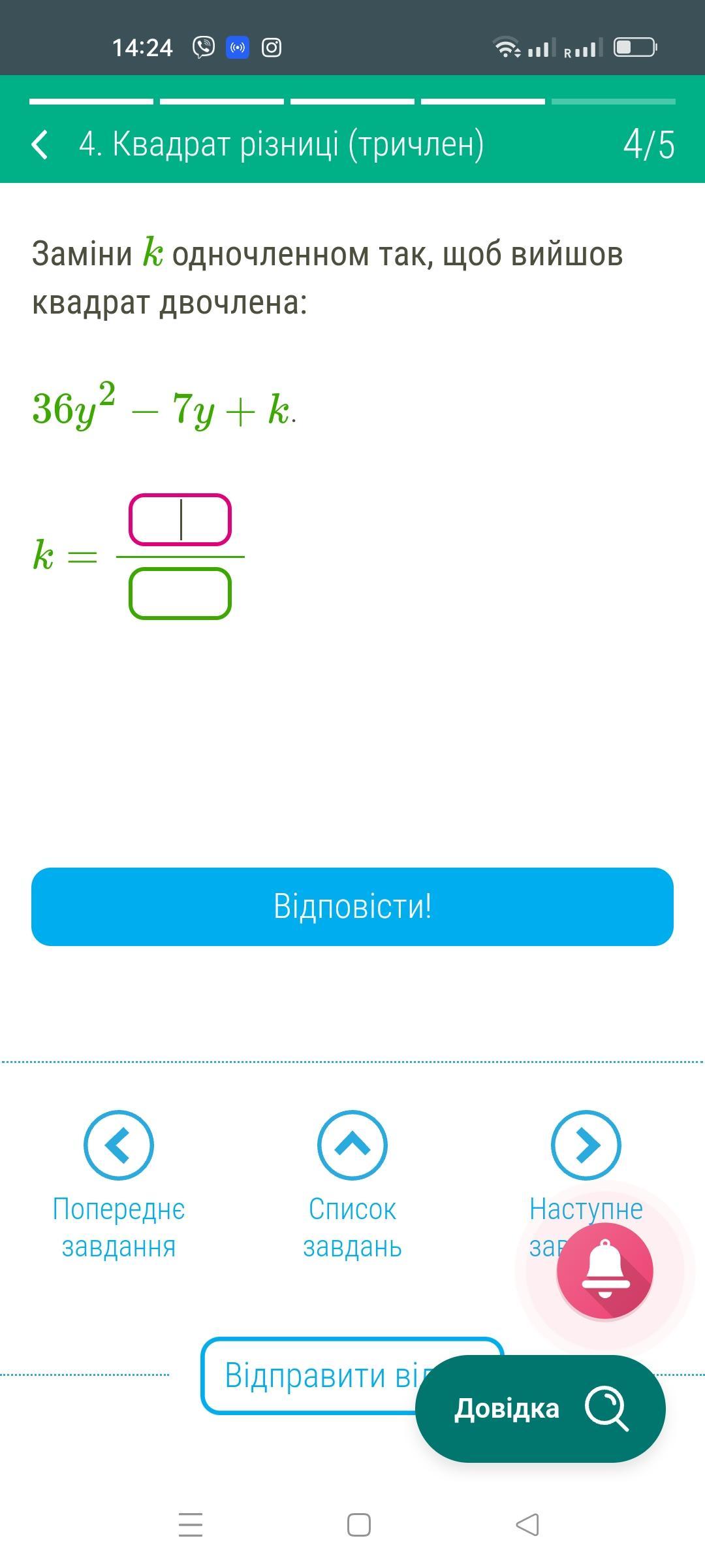 36у²-7у+k=(6у)²-2*(6у)*(7/12)+(7/12)²