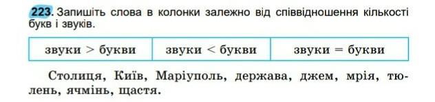 223. Запишіть слова в колонки залежно від співвідношення кількості букв і звуків. звуки > букви звуки < букви звуки = букви Столиця, Київ, Маріуполь, держава, джем, мрiя, тю- лень, ячмінь, щастя.