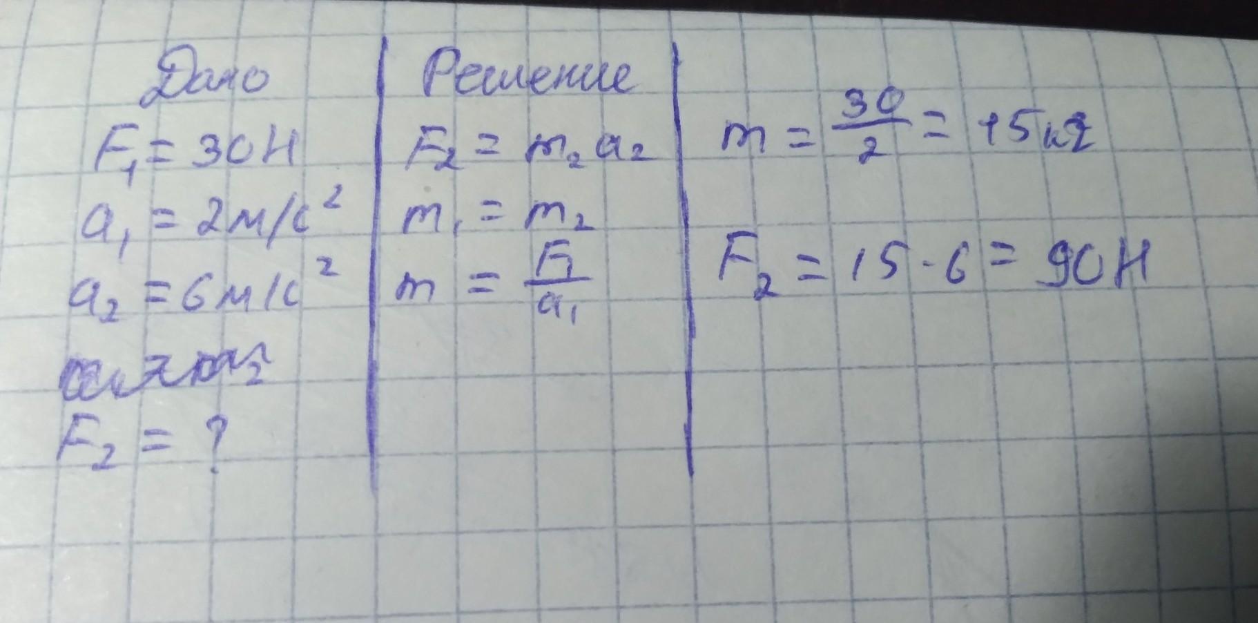 Сила 30 H сообщает телу ускорение 2 м/с2 Вычислитте силу которая сообщит этому телу ускорение 6м/с2