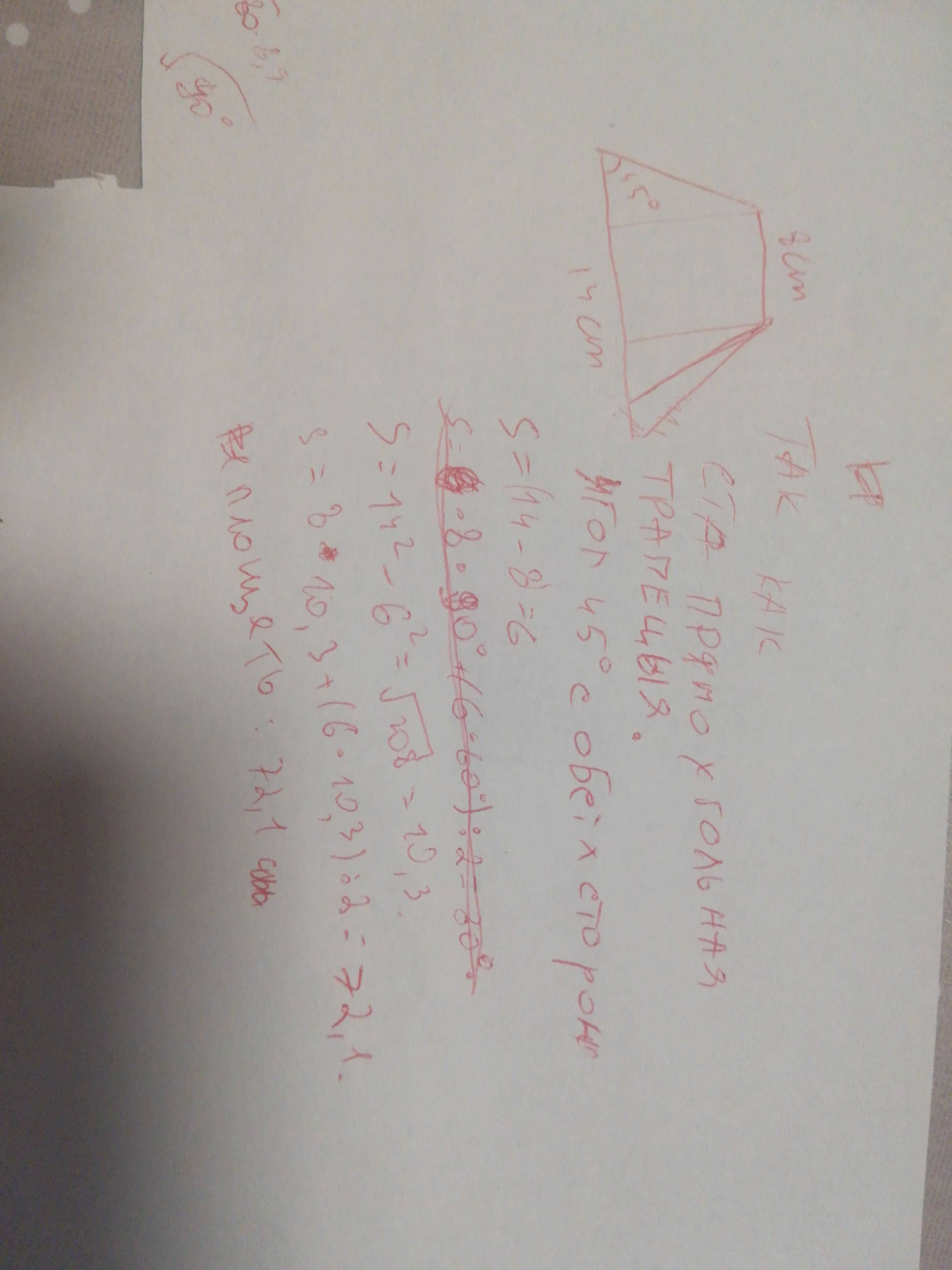 Найдите площадь прямоугольной трапеции, если её основания равны 8 см м 14 см, а один из углов 45°.