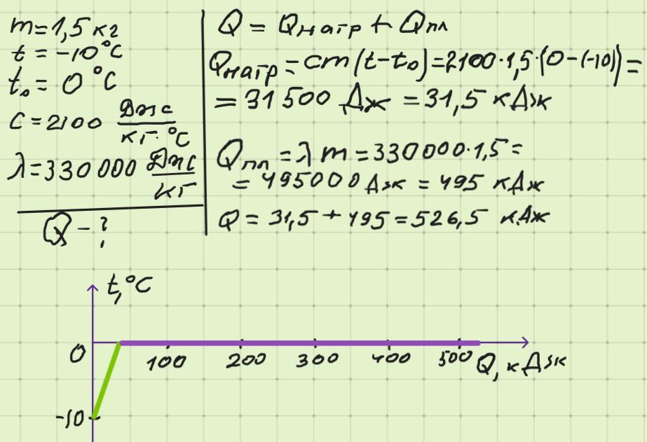 Визначте кількість теплоти, яка потрібна для плавлення льоду масою 1.5 кг, взятого при температурі -10°С.(Оформити розв'язок задачі. Обов'язково графік! )