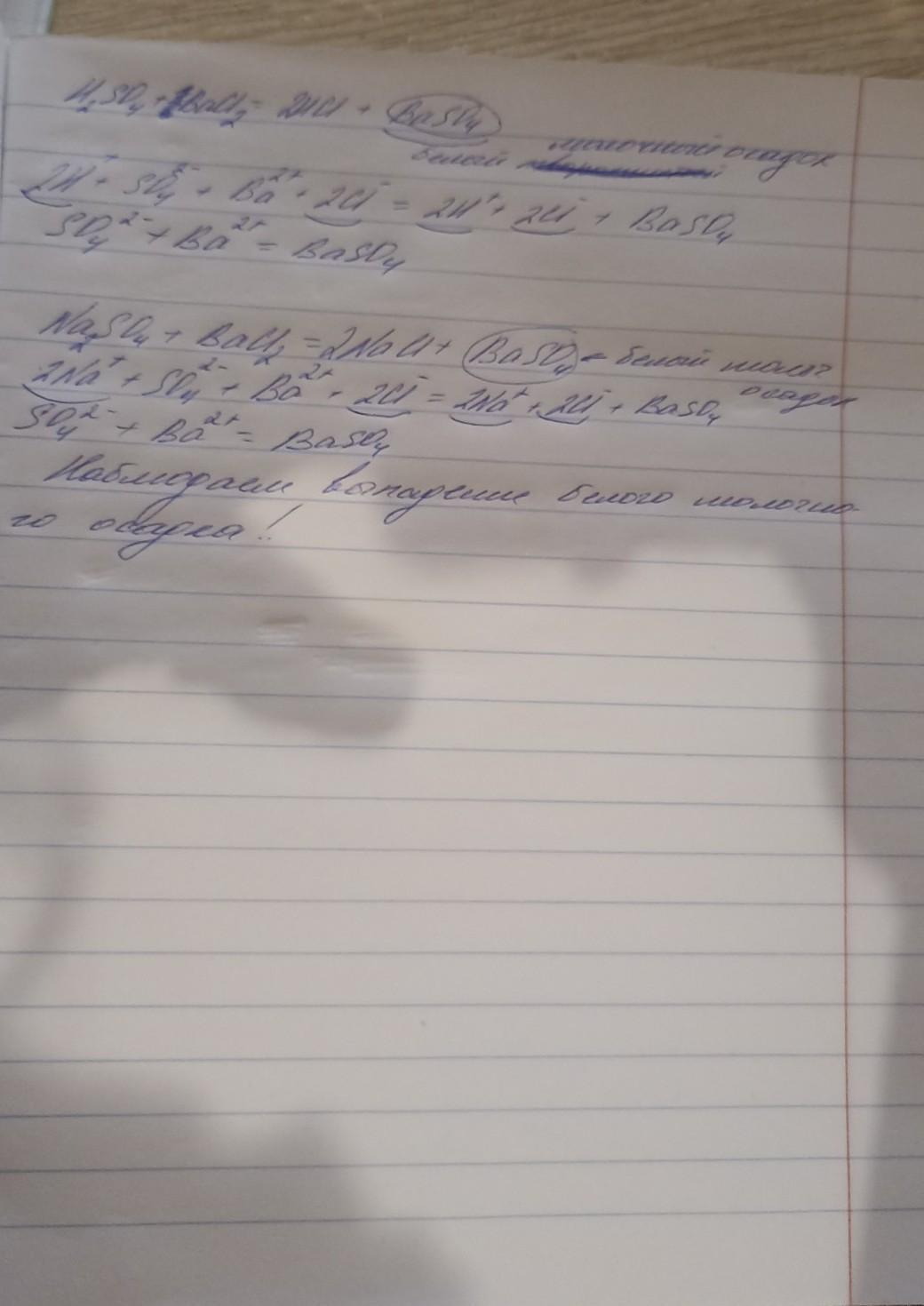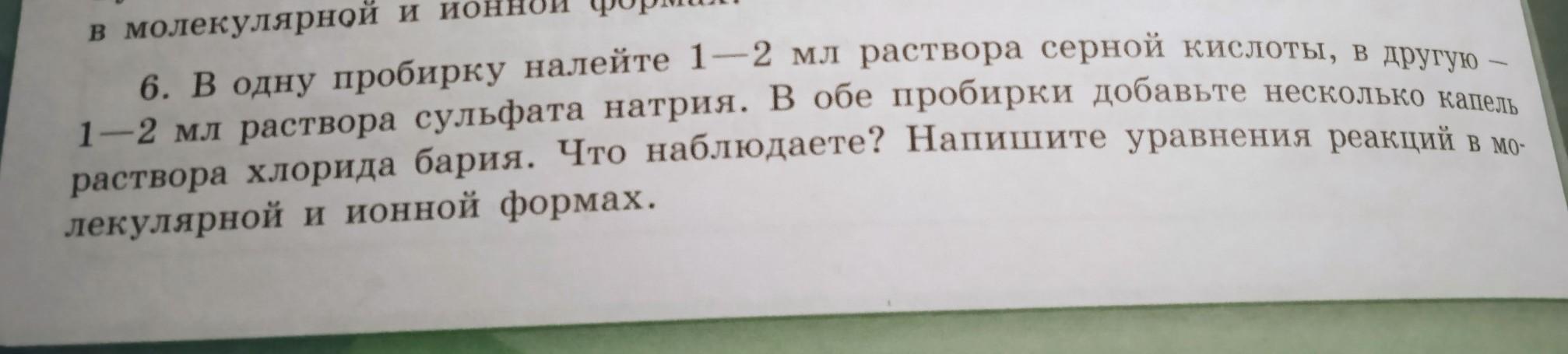 в одну пробирку налейте 1–2 мл раствора серной кислоты,в другую – 1–2 мл раствора сульфата натрия. В обе пробирки добавьте несколько капель раствора хлорида бария. Что наблюдаете? Напишите уравнения реакций в молекулярной и ионной формах
