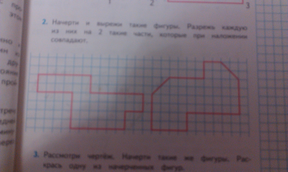 начерти и вырежи такие фигуры. разрежь каждую из них на 2 части которые при наложении совпадают.