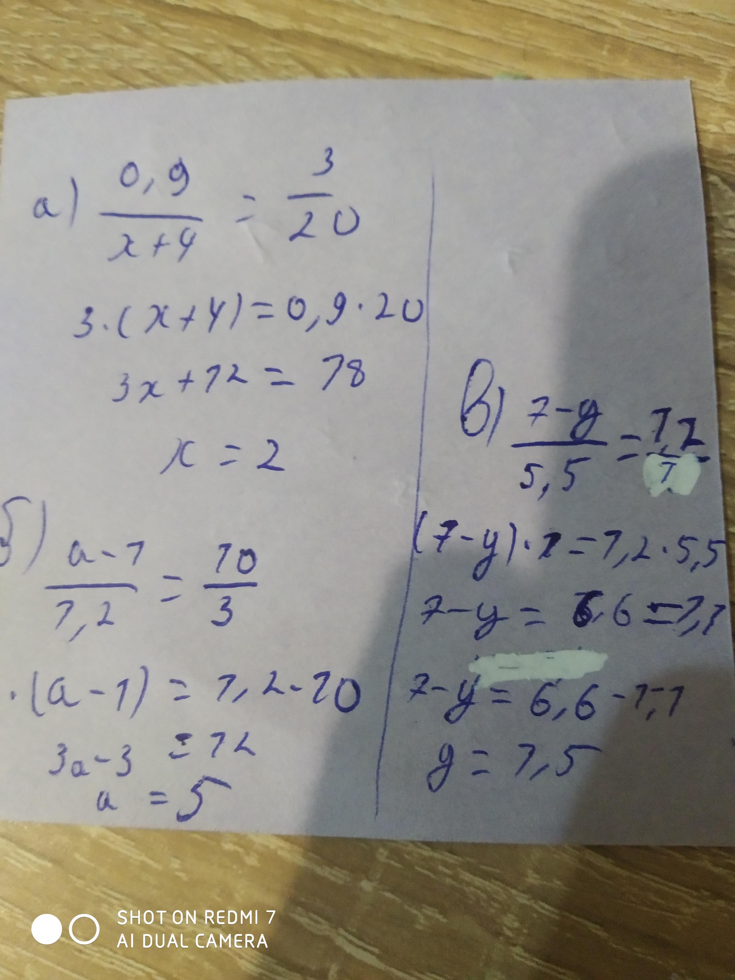 а) 0,9/ x + 4 = 3/20. б) а - 1/ 1,2= 10/3. в) 7-у/5,5 = 1,2 = 1,1