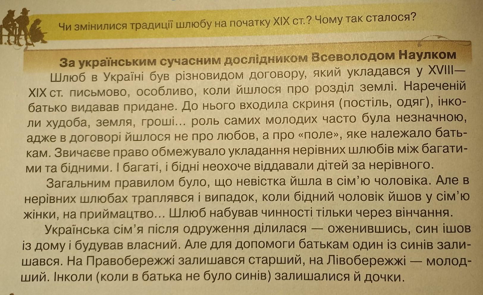 У XIX ст. в Україні парубки найчастіше одружувалися після служби у війську. Якщо з якоїсь причини хлопець не йшов до війська, до досягнення 21 року він, як правило, не одружувався. Дівчата виходили заміж переважно в 16—18 років. Чинне законодавство забороняло церкві вінчати неповнолітніх (дівчат — до 16 років, хлопців — до 20 років). Для більш раннього укладення шлюбу потрібний був окремий дозвіл лікаря та місцевої влади.
