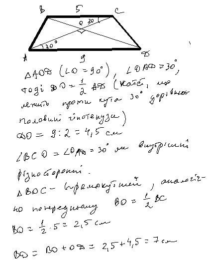 у трапеції ABCD (AD//BC) діагоналі перпендикулярні CAD =30 знайди довжину діагоналі BD якщо основи трапеції дорівнює 5 см і 9 см.
