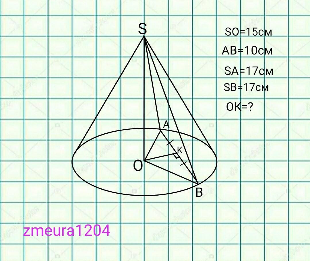 Через дві твірні конуса проведено площину. Довжина хорди АВ дорівнює 10 см. Твірна і висота конуса відповідно дорівнюють 17 см і 15 см. Знайдіть відстань від центра основи до хорди АВ.