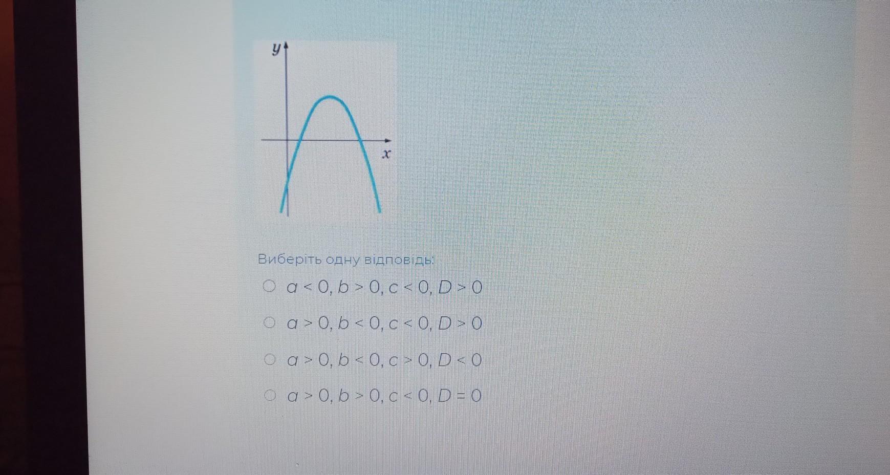 – На малюнку зображено графік квадратичної функції у = ax2 + bx + c. Укажіть правильне твердження, якщо D - дискримінант квадратного тричлена аx2 + bx + c.