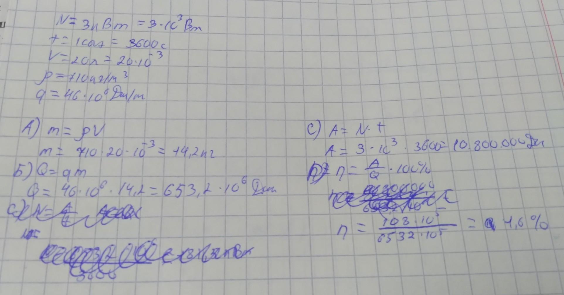 Қуаты 3 кВт іштен жанатын қозғалтқыш 1 сағат ішінде 20 л бензин жақты.Бензиннің тығыздығы 710кг/м 3 . Бензиннің жану жылуы 46*10 6 Дж/кг А)Бензиннің массасын анықтаңдар Б)Бензин толық жанғанда бөлінетін жылу мөлшерін анықтаңдар. С) Қуаттың формуласын қолданып жұмысты анықтаңдар Д) Іштен жанатын қозғалтқыштың ПӘК анықтаңдар??