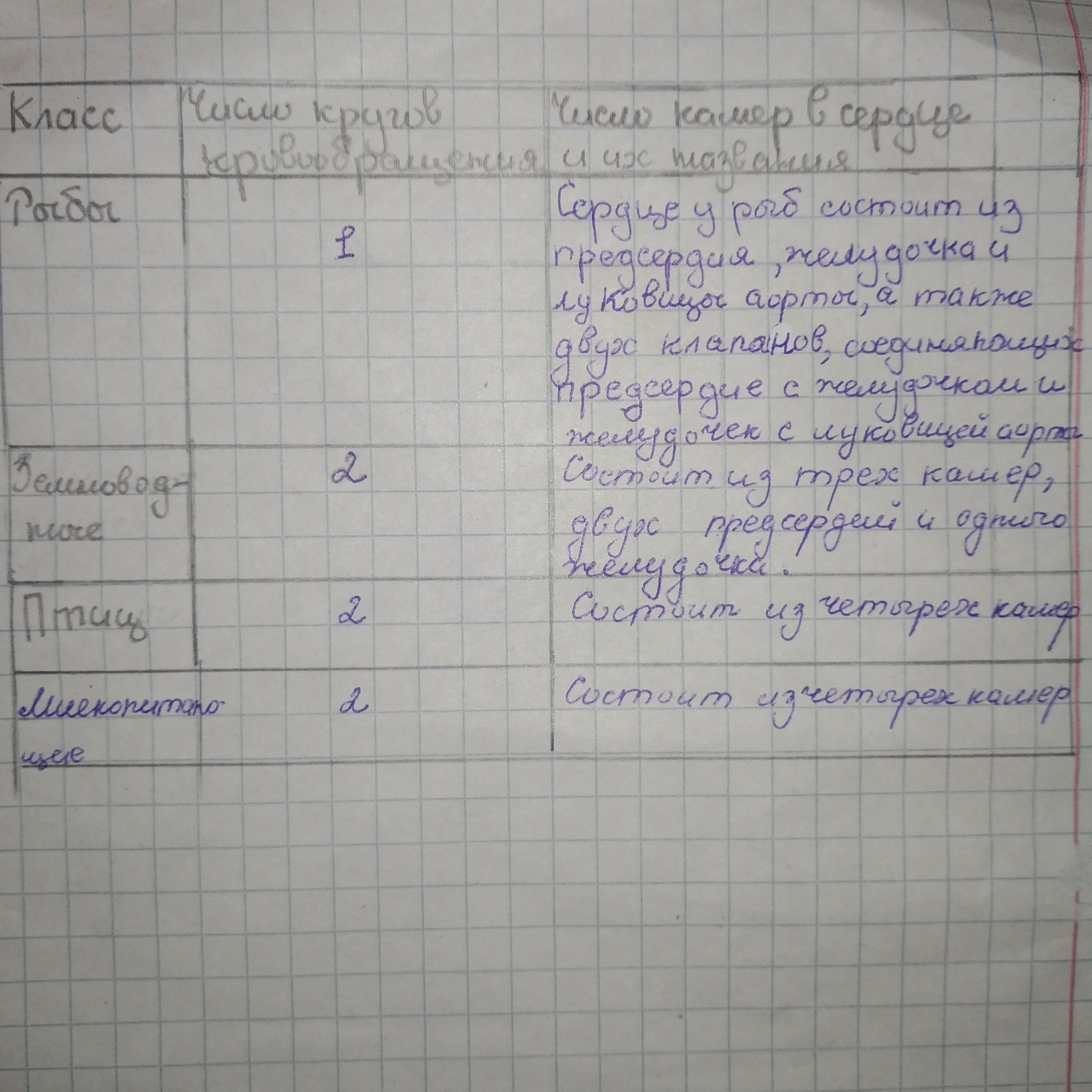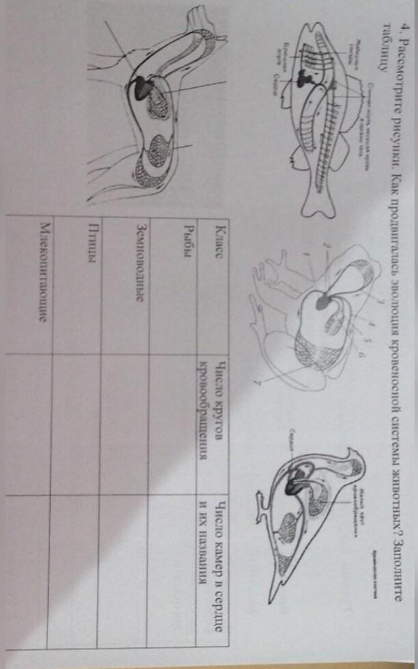 4. Рассмотрите рисунки. Как продвигалась эволюция кровеносной системы животных? заполните таблицу Рыбы Земноводные Число кругов кровообращения Число камер в сердце а их названня Птицы Млекопитающие