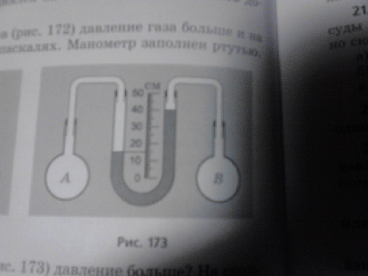 В каком из сосудов давление больше? На сколько (ответ выразите в паскалях), если манометр заполнен водой?