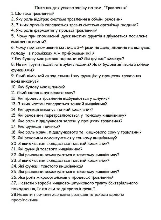 Питання для усного заліку по темі "Травлення" 1. Що таке травлення, 2. Яку роль відіграє система травлення в обміні речовин? 3. З яких органів складається травна система організму людини? 4. Яка роль ферментів у процесі травлення, 5. Чому при споживанні дуже кислих фруктiв вiдбувається посилене видiлення слини? 6. Чому при споживанні їжі лише 3-4 рази на день, людина не відчуває голоду в проміжках між прийомами їжі ? 7.Яку будову має ротова порожнина? Які функції виконує? 8. На які групи поділяють зуби людини? Як їх будова зв'язана з їхніми функцiями? 9. Який хiмiчний склад слини і яку функцію у процесах травлення вона виконує? 10. Яку будову має шлунок? 11. Який склад шлункового соку? 12. Які процеси травлення відбуваються у шлунку? 13. З яких частин складається тонкий кишківник? 14. Які функції виконує тонкий кишківник? 15. Які речовини перетравлюються у тонкому кишківнику? 16. Яка роль пiдшлункової залози у процесах травлення? 17. Яка функцiя печінки, 18. Яка роль жовчі, підшлункового та кишкового соку у травленні? 19. Які речовини всмоктуються у тонкому кишківнику? 20. З яких частин складається товстий кишкiвник? 21. Якi функцiï товстого кишківника? 22. Які речовини всмоктуються в товстому кишківнику? 23. З яких частин складається товстий кишкiвник? 24. Які функцiï товстого кишківника? 25. Які речовини всмоктуються в товстому кишківнику? 26. Яка роль мікроорганізмів у процесах травлення? 27. Назвати хвороби кишково-шлункового тракту бактерiального походження, їх ознаки та джерела інфекції. 28.Назвати причини харчових розладів та заходи щодо їх профілактики.