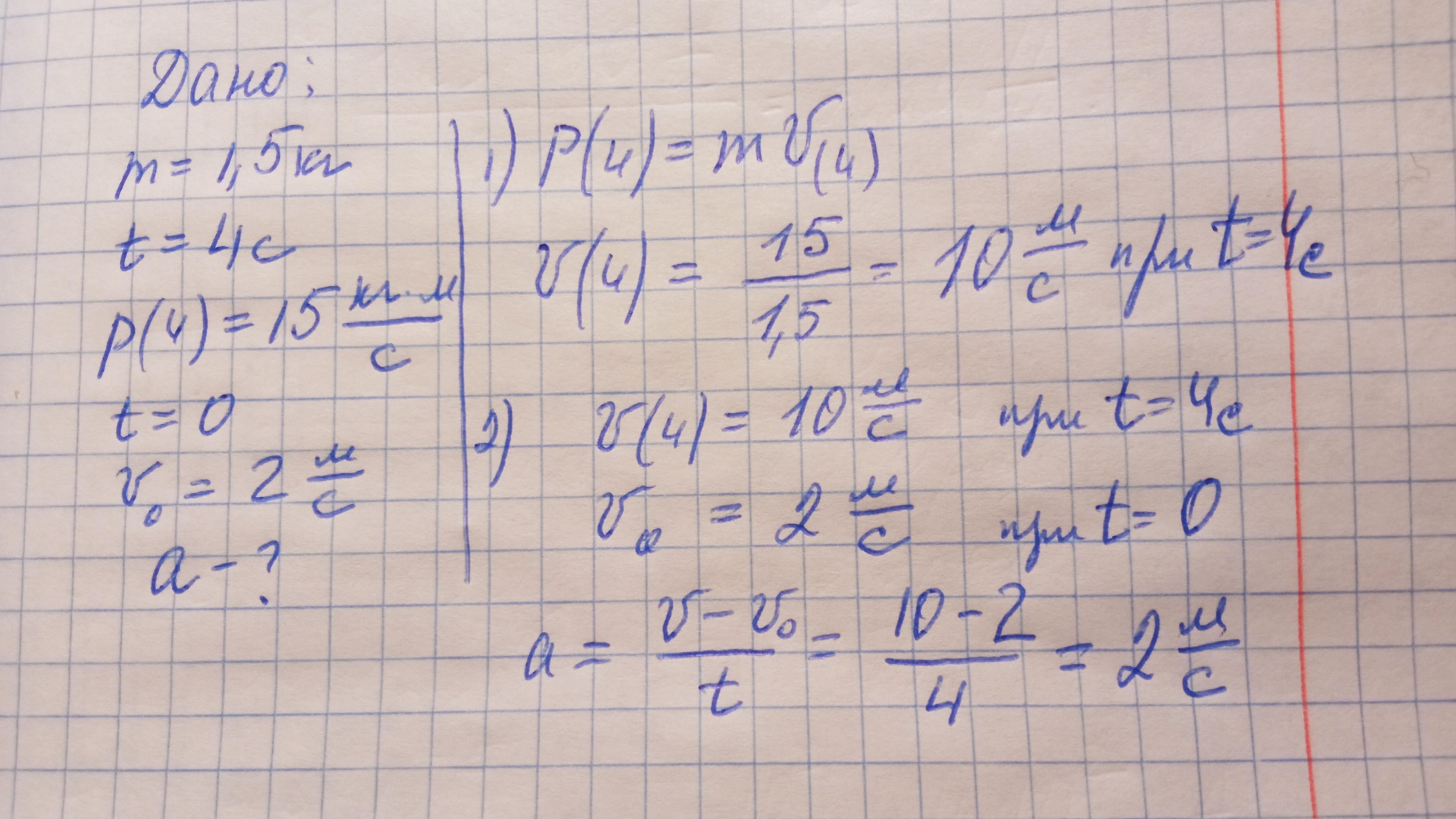 Тело массой 1,5 кг движешься равноускоренно с ускорением (a) и в момент времени 4 с имеет импульс 15 кг*м/с. Начальная скорость тела V0=2 м/с. Определите значение ускорения (a). Вектор начальной скорости тела и вектор ускорения сонаправленны