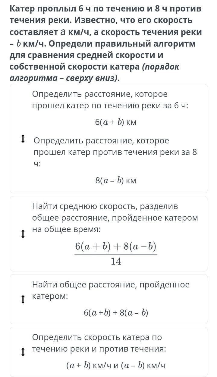 Катер проплыл 6 ч по течению и 8 ч против течения реки. Известно, что его скорость составляет а км/ч, а скорость течения реки – b км/ч. Определи правильный алгоритм для сравнения средней скорости и собственной скорости катера (порядок алгоритма - сверху вниз). I Определить расстояние, которое прошел катер против течения реки за 8 Определить расстояние, которое прошел катер по течению реки за 6 ч: 6(a + b) км 1 ч: Найти среднюю скорость, разделив общее расстояние, пройденное катером на общее время: I 1 8(a - b) км Найти общее расстояние, пройденное 1 катером: 6(a + b) + 8(a -b) 14 6(a+b) + 8(a - b) Определить скорость катера по течению реки и против течения: (a + b) км/ч и (a - b) км/ч Сравнить среднюю и собственную скорости катера