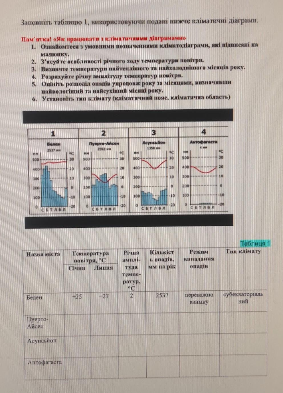 використовуючи кліматичну діаграму яка на фото заповнити нижче таблицю
