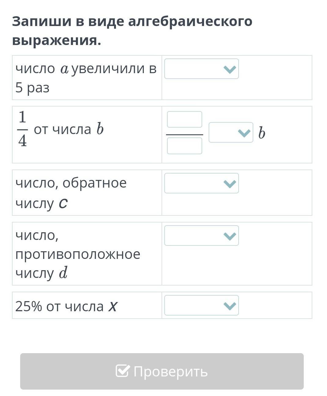 Запиши в виде алгебраического выражения. число а увеЛИЧИЛИ В 5 раз 1 - 4 от числа b число, обратное числу с число, противоположное числу а 25% от числа X b