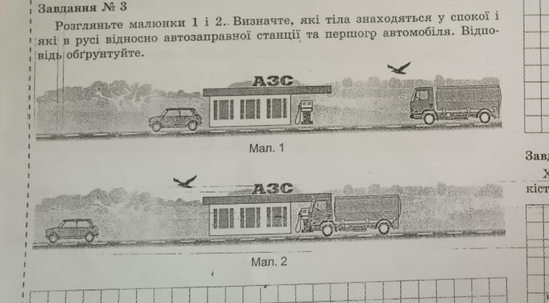 Относительно первого автомобиля движется птица, заправочная станция и деревья. так как расстояние между данным авто и всем перечисленным изменяется.