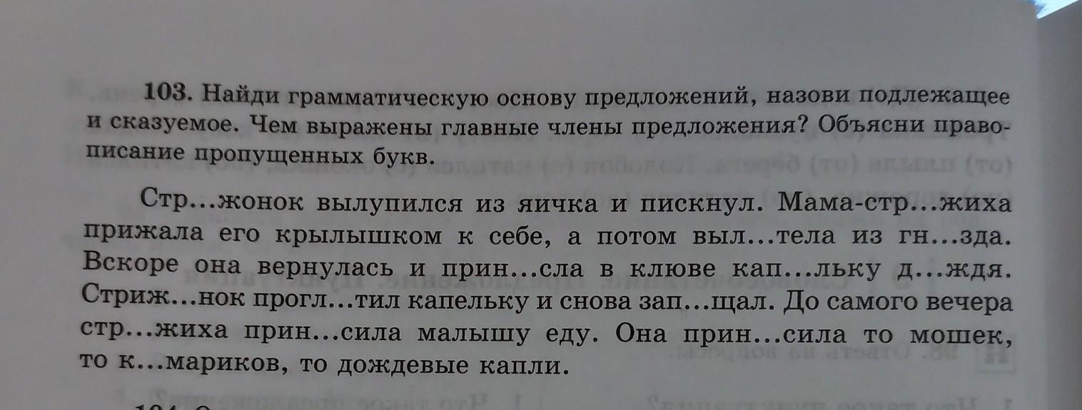 103. Найди грамматическую основу предложений, назови подлежащее и сказуемое. Чем выражены главные члены предложения? Объясни право- писание пропущенных букв.