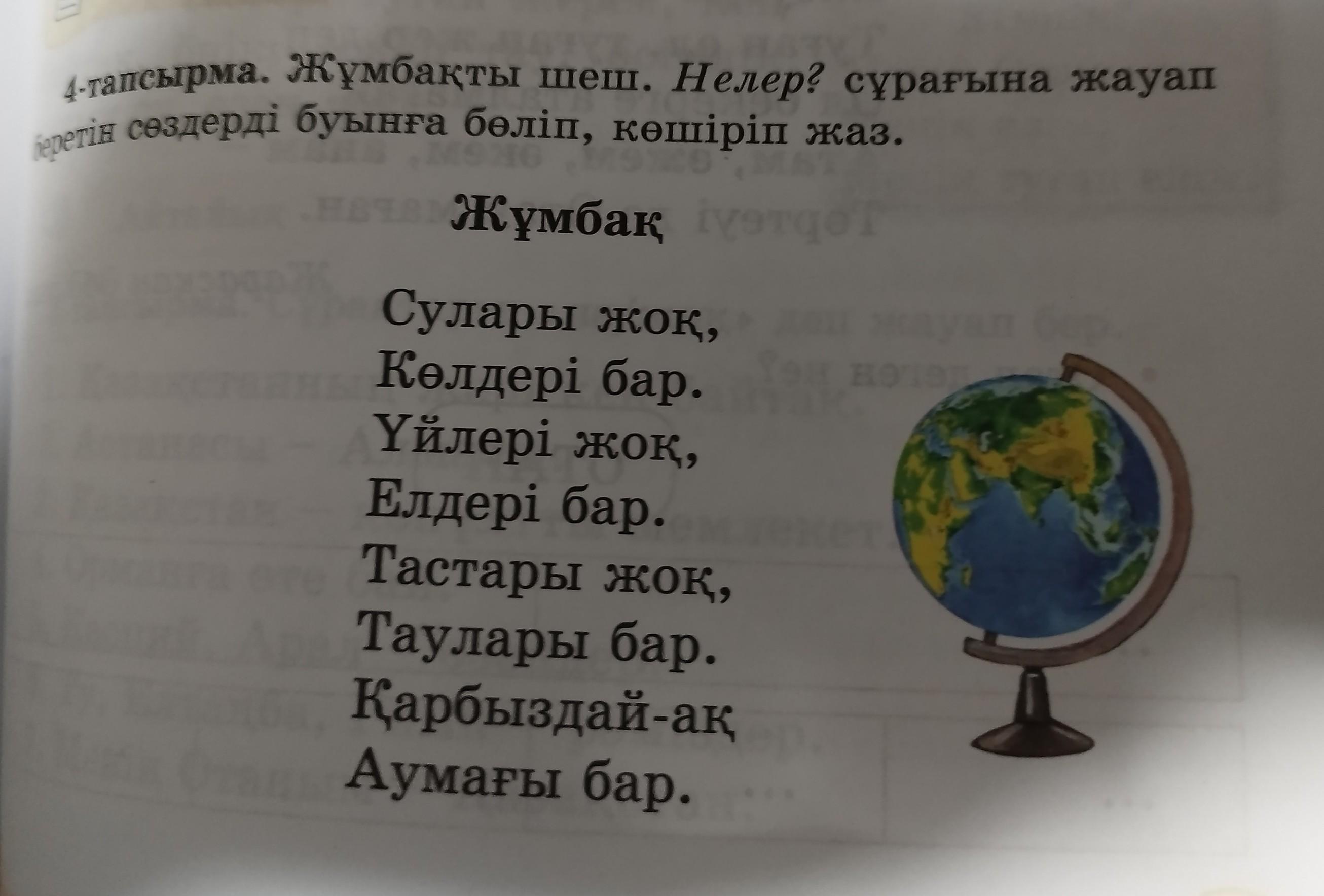 шешуі: глобус. су-ла-ры, көл-де-рі, үй-лері, ел-де-ірі, тас-та-ры, тау-ла-ры.
