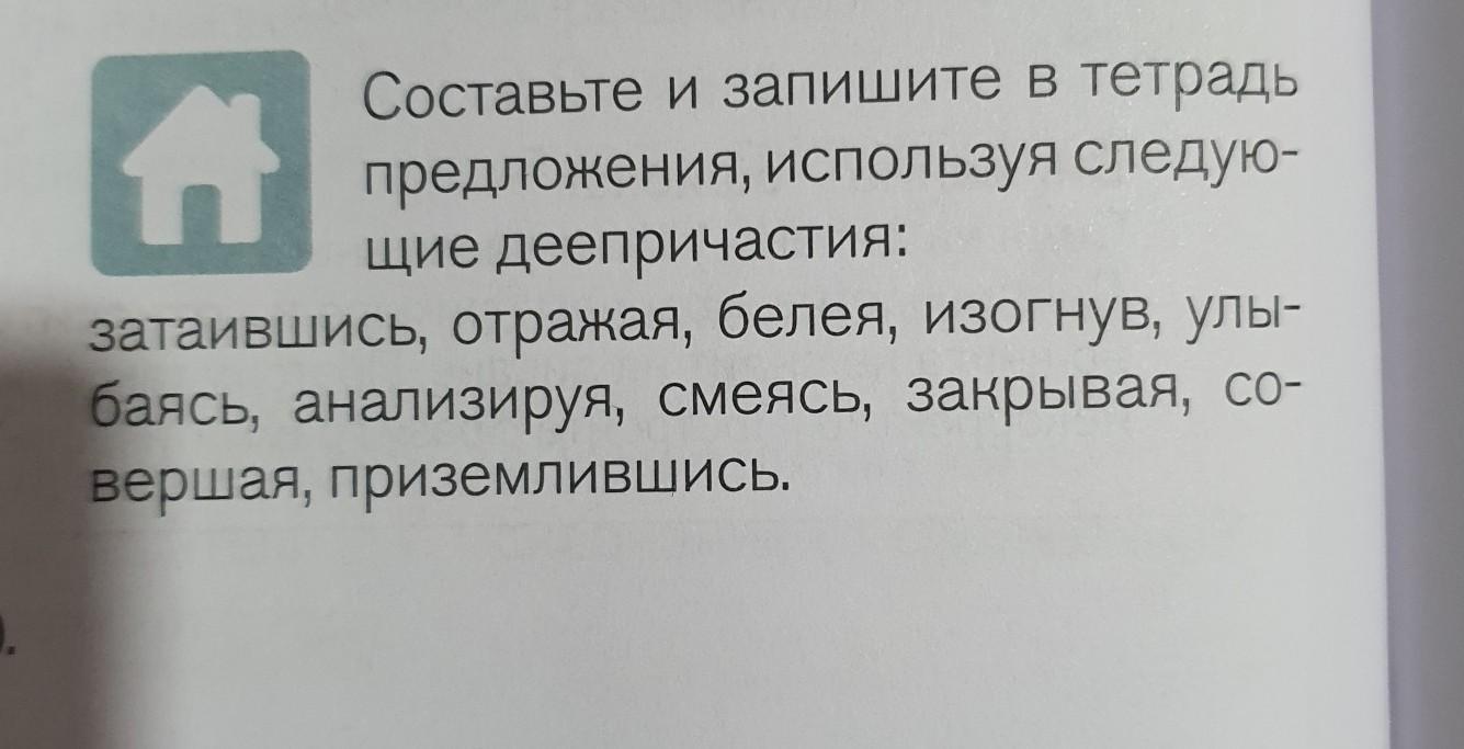 Составьте и запишите в тетрадь предложения, используя следую- щие деепричастия: затаившись, отражая, белея, изогнув, улы- баясь, анализируя, смеясь, закрывая, со- вершая, приземлившись.