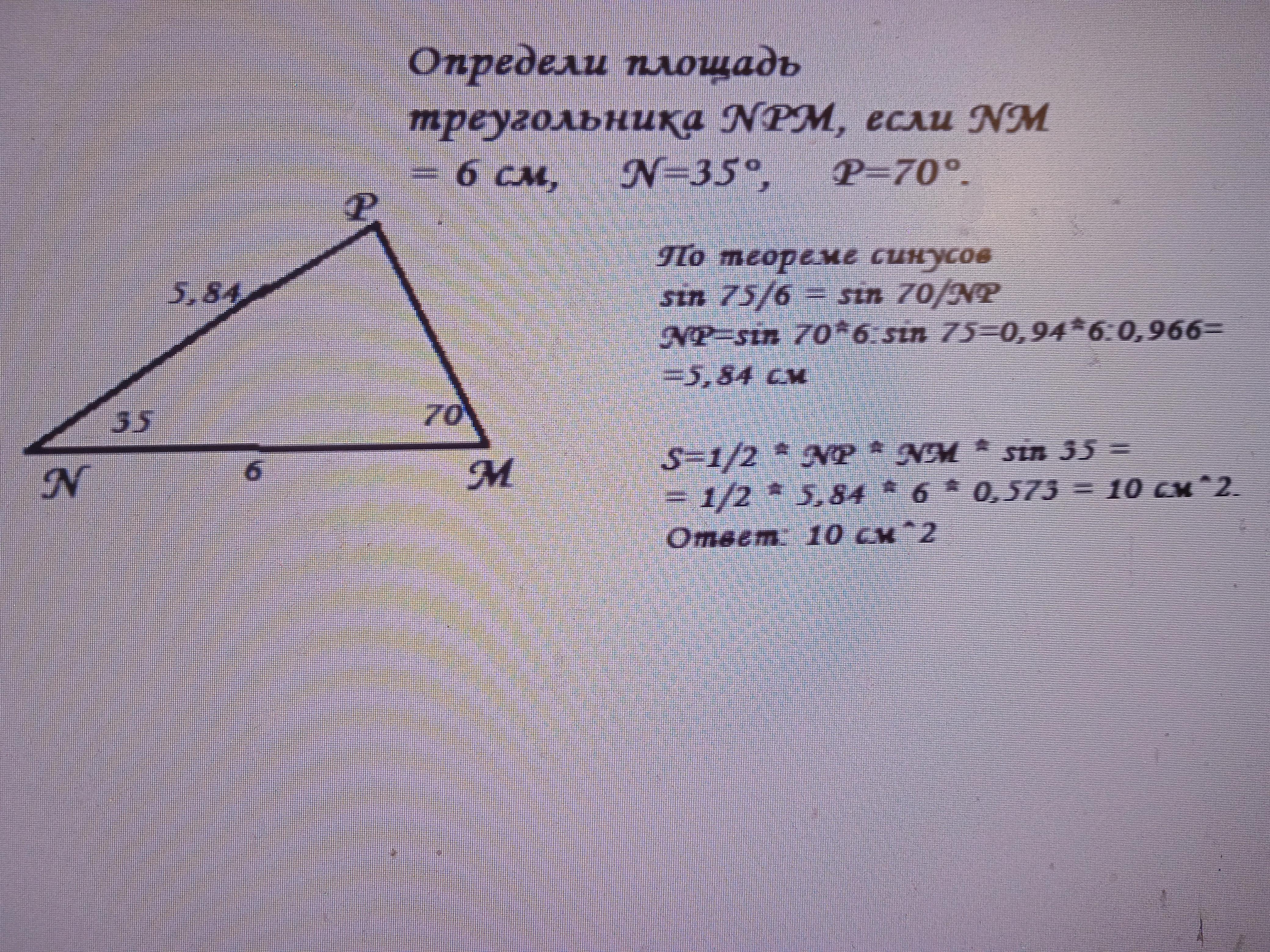Определи площадь треугольника NPM, если NM = 6 см, ∡N=35°, ∡P=70°.