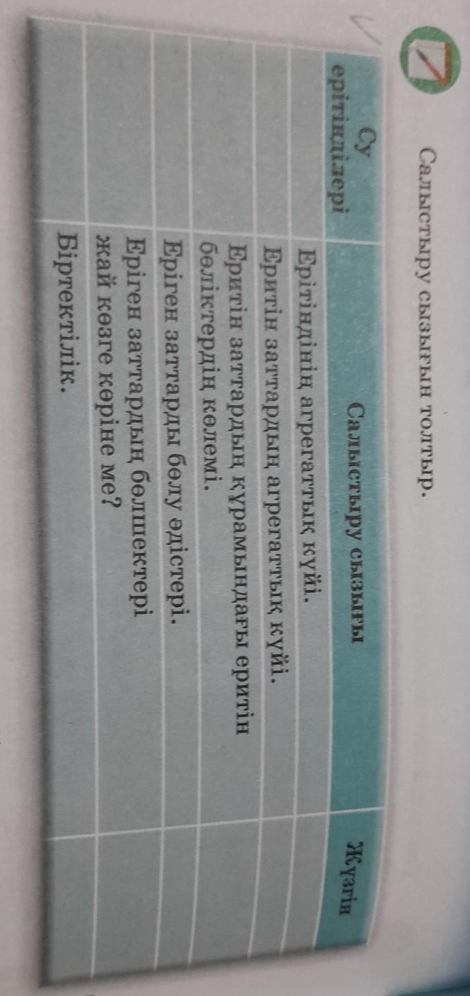 Салыстыру сызығын толтыр. Cy ерітінділері Салыстыру сызығы Ерітіндінің агрегаттық күйі. Еритін заттардың агрегаттық күйі. Еритін заттардың құрамындағы еритін бөліктердің көлемі. Еріген заттарды бөлу әдістері. Еріген заттардың белшектері жай көзге көріне ме? Біртектілік. Жүзгін.