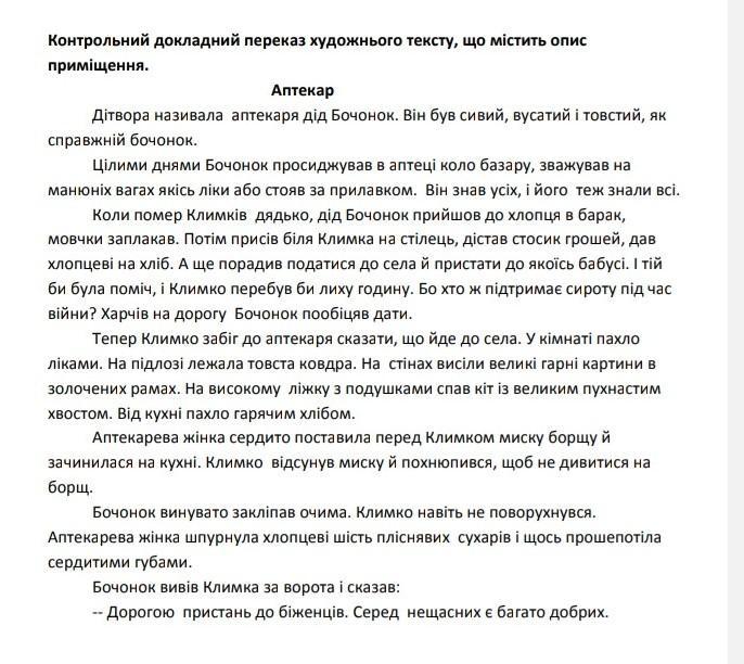 Українська Література контрольна робота. Написати докладний переказ запропонованого тексту Аптекар у переказі обов'язково має бути опис кімнати. срочно допоможіть будь ласка дам 80 балів і корону.