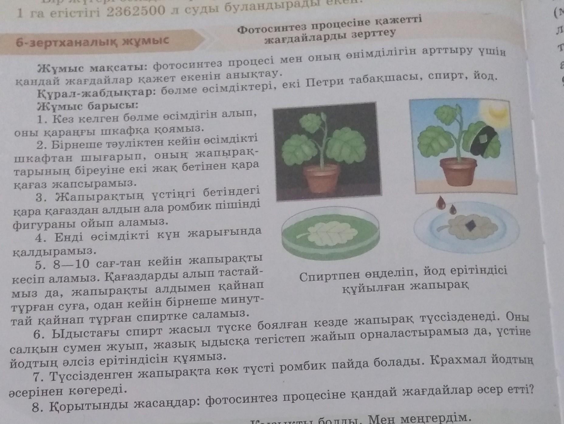 Өсімдікті күн көзіне қою, йод құю әсер етті деп ойлаймын. Қорытынды: Крахмал йодтың әсерінен көгереді, спирт жасыл түске боялған кезде жапырақ түссізденеді.