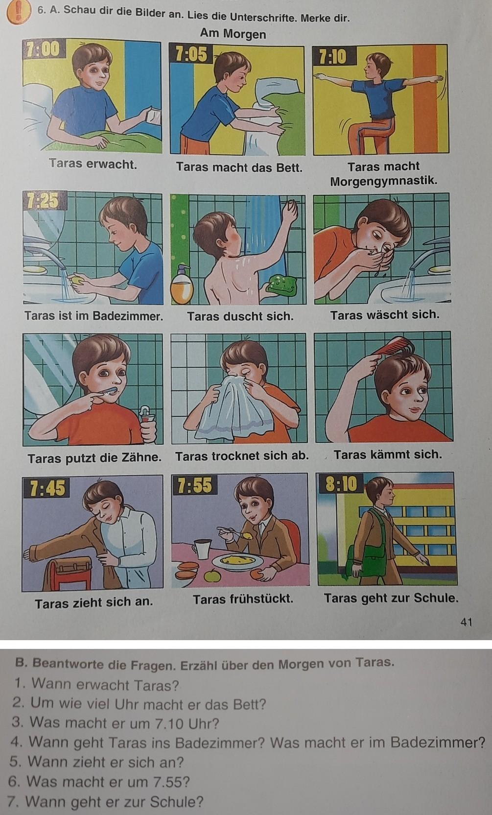 5. Im Badezimmer wäscht Taras die Hände, duscht sich, wäscht sich, putzt die Zähne, trocknet sich ab und kämmt sich.
