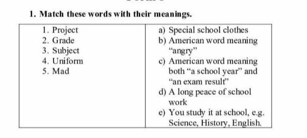 1. Match these words with their meanings. 1. Project 2. Grade 3. Subject 4. Uniform 5. Mad. a) Special school clothes b) American word meaning "angry" c) American word meaning both "a school year" and "an exam result" d) A long peace of school work e) You study it at school, e.g. Science, History, English.