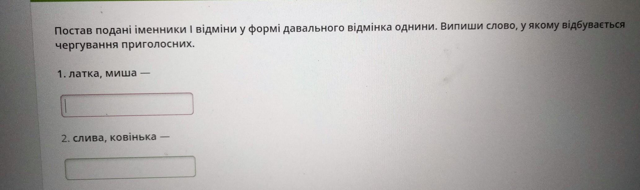 Латка — (чому) латці; миша — (чому) миші; к-ц