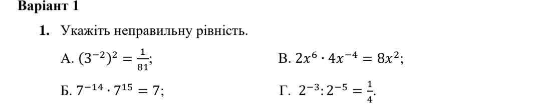 правильный ответ Г,потому-что в условии нужно указать неправильное равенство,а вариант Б является правильным 7^(-14)•7^(14)=7^1