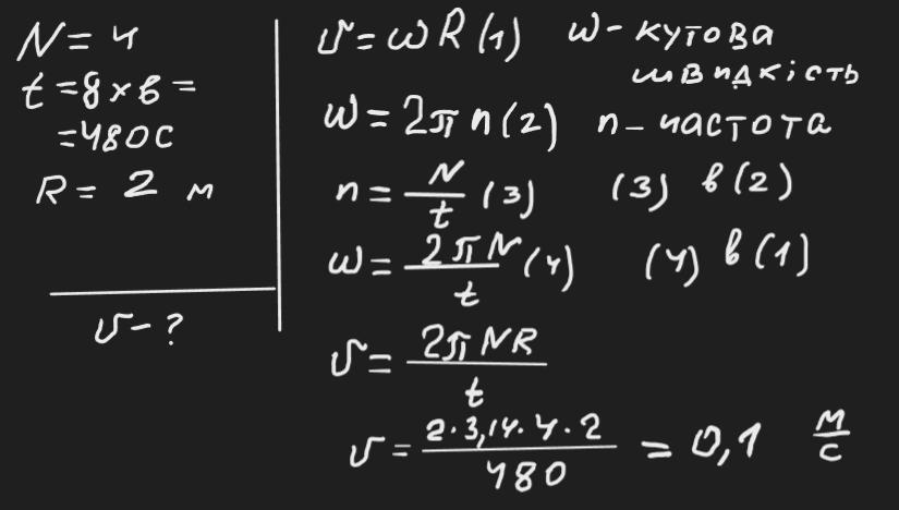 Платформа дитячої каруселі робить 4 повних оберти за 8 хвилин. Визначте лінійну швидкість точок платформи, віддалених від осі обертання на 2 метри. Відповідь округліть до одного знаку після коми і подайте у м/с.