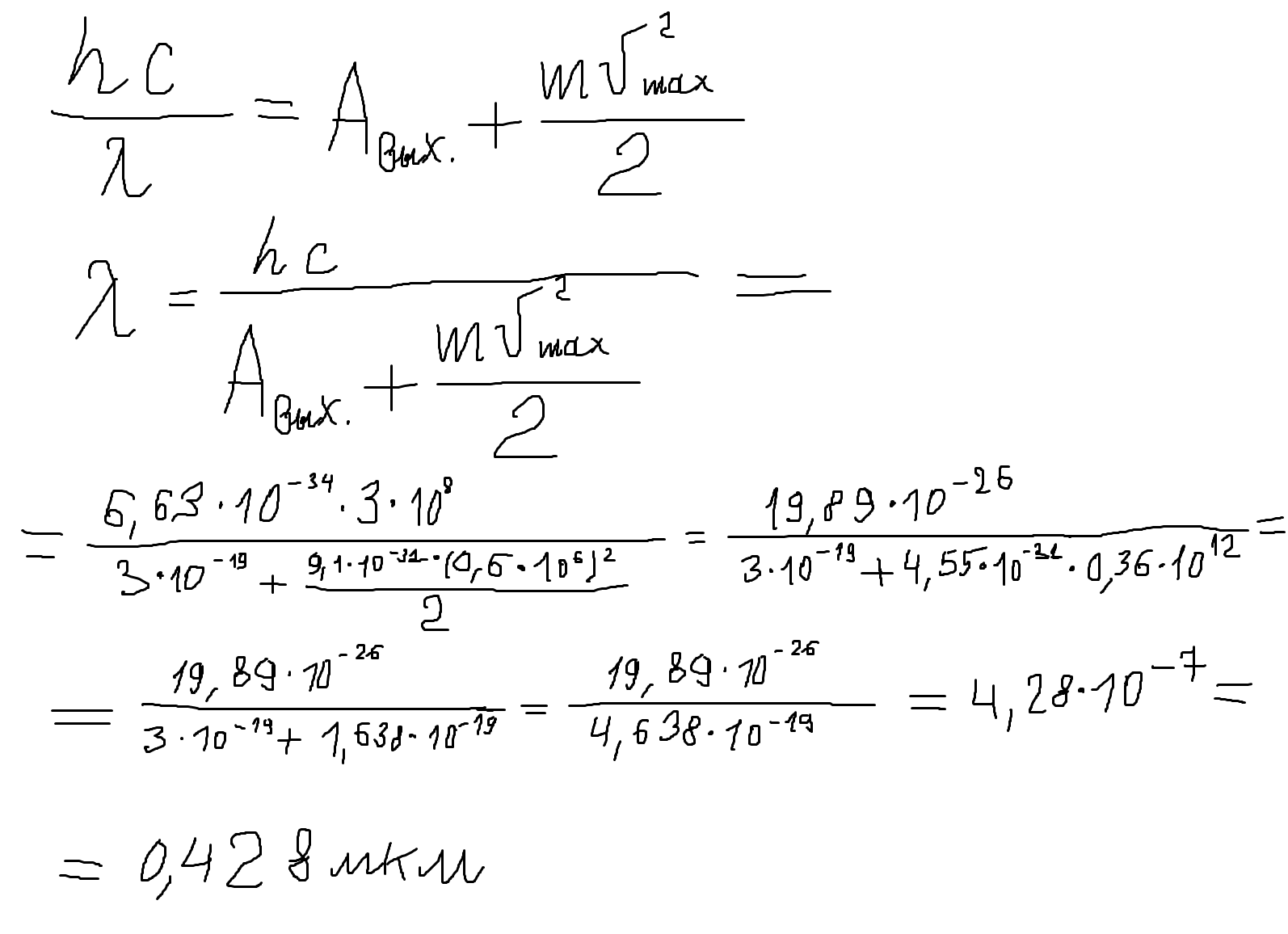Работа выхода электрона из цезия равна 3*10^-19 Дж. Найдите длину волны падающего на поверхность цезия света, если скорость фотоэлектронов равна 0,6*10^6 м/с.
