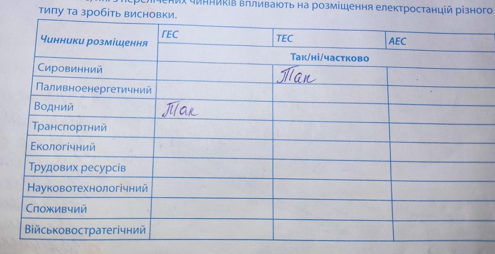 Визначте, які з перелічених чинників впливають на розміщення електростанцій різного типу та зробіть висновки