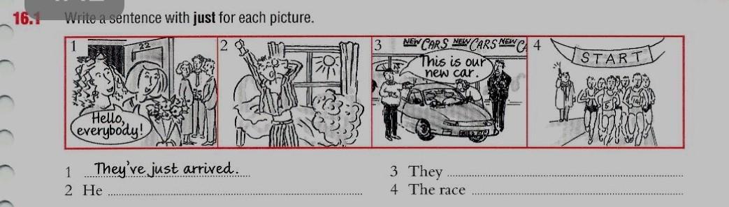 16.1 Write a sentence with just for each picture. Hello, everybody! They've just arrived. 1 2 He 3 NEW CARS NEW CARS NEW CA 4 This is our new car. TEST 3 They 4 The race START